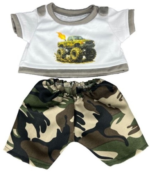 De combinatie van een coole camouflagebroek en een T‑shirt met monstertruckprint maakt deze outfit perfect voor kinderen die houden van actie, racen en fantasierijke avonturen.